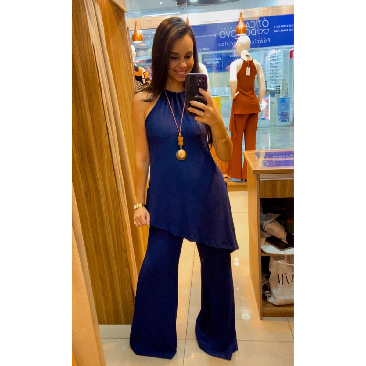 A blusa assimétrica com modelagem soltinha e decote halter (fechado no pescoço) proporciona um visual moderno e sofisticado, já a calça pantalona tem cintura alta e caimento fluido, alongando a silhueta e trazendo elegância instantânea.