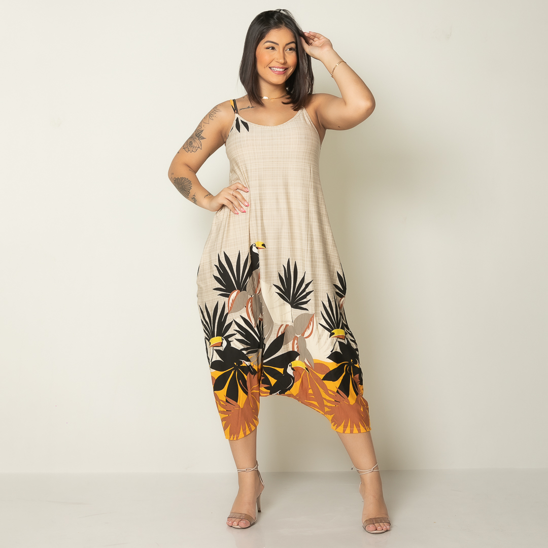 Ideal para diversas ocasiões, este macacão pode ser combinado com acessórios para um look mais elegante ou utilizado de forma mais casual para um estilo despojado. Suas estampas digitais, garantem um visual moderno e sofisticado. Para conservar a peça, siga corretamente as instruções de lavagem e secagem, realizando o processo à mão com sabão neutro e evitando o uso de secadora.