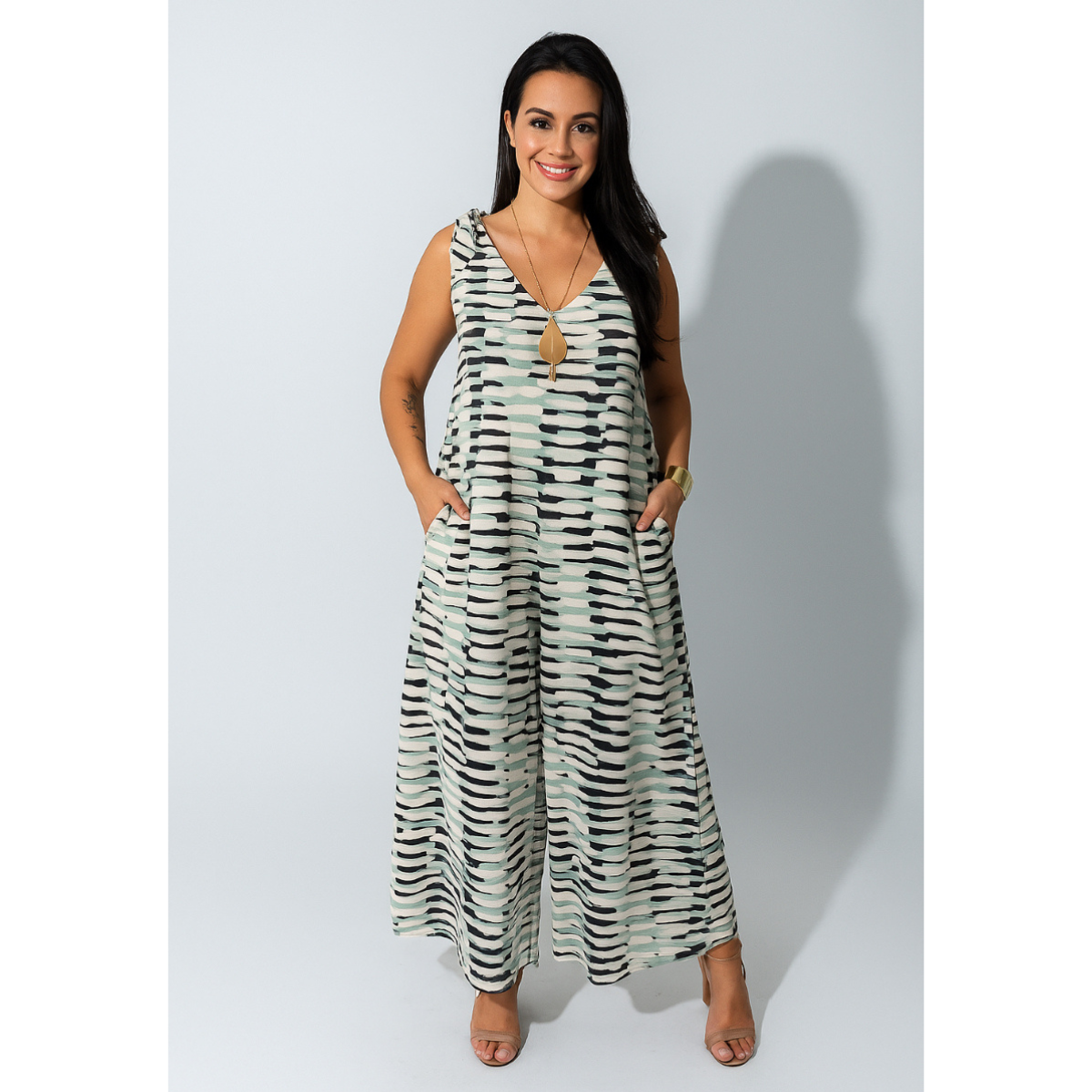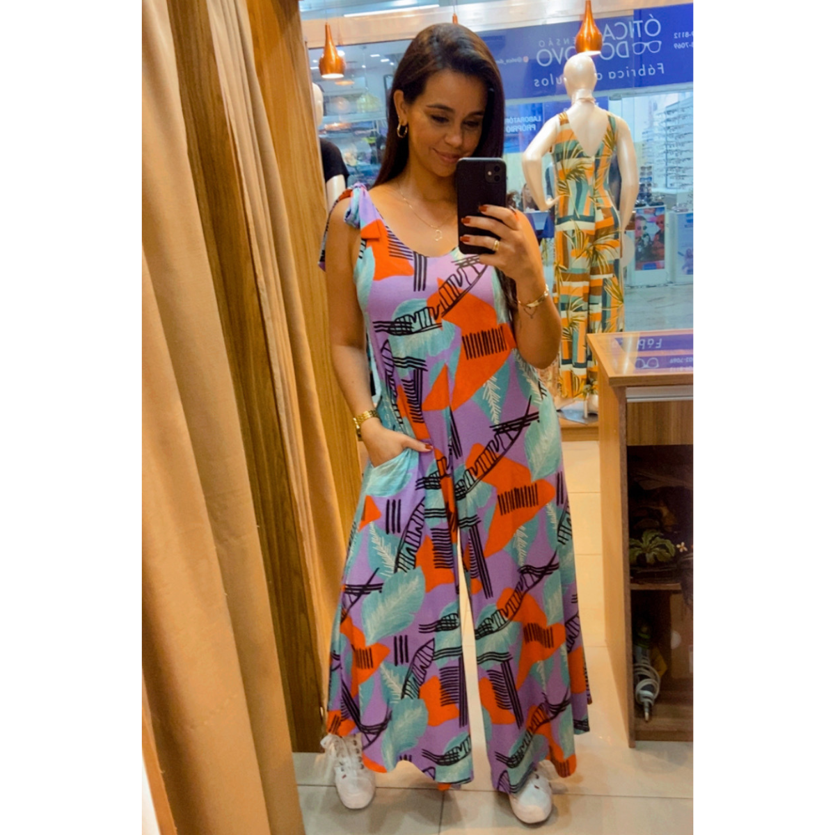 Macacão Pantacourt, um look para mulheres modernas que não abrem mão do conforto na hora de se vestir, produzido em malha ( 96% viscose e 4% elastano), com amarração nas alças e bolsos laterias. Tamanho único indicamos até o 46/48.